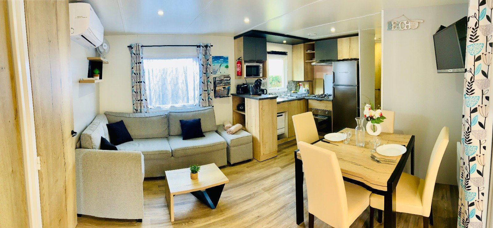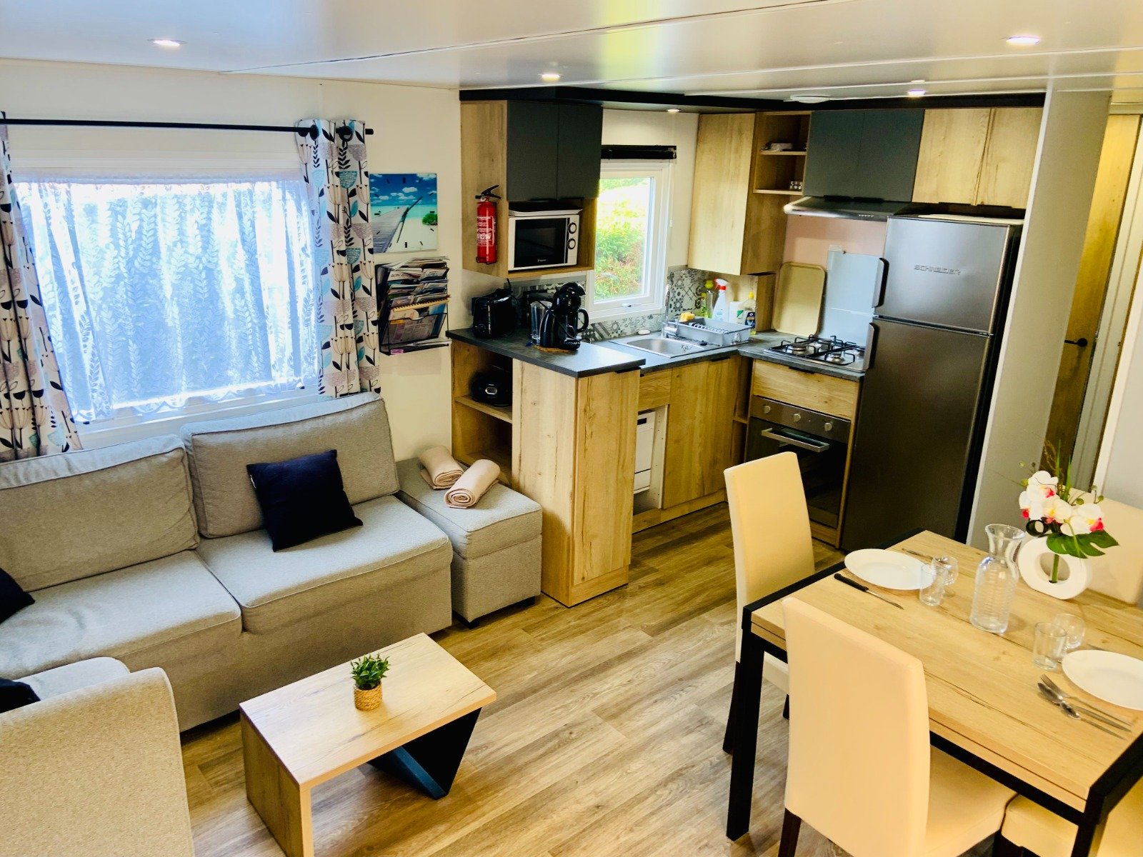 Ce mobil home tout confort est climatisé, à proximité d’un parc aquatique de 4 piscines, d’un bassin lagon, bassins chauffés à 30° (intérieur comme extérieur).