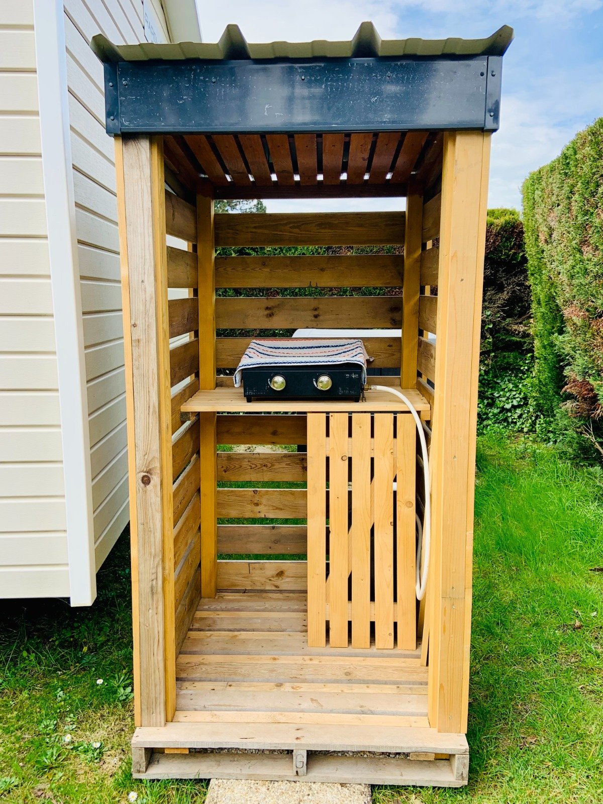 Le Mobil home est équipé d’un lit bébé parapluie et d’une chaise haute.